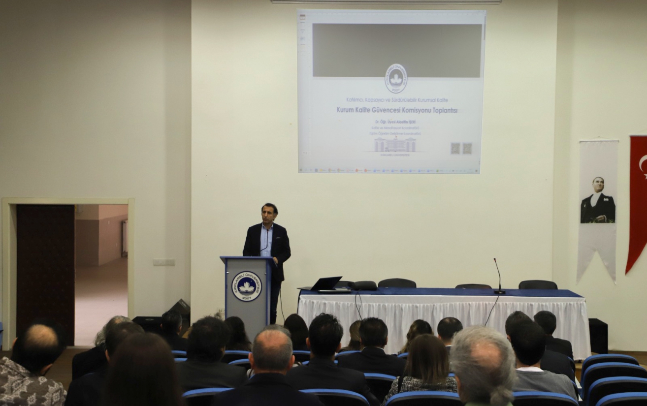 Düzenlenen toplantıda Kalite ve Akreditasyon Koordinatörü Dr. Öğretim Üyesi Alaettin İŞERİ, Üniversitemiz Senatosunun 06.11.2025 tarihli ve 175 No’lu toplantısının 5 No’lu kararı ile kabul edilen “Kırklareli Üniversitesi Kurum Kalite Güvence Sistemi Yönergesi”nin ilgili hükümleri gereğince eğitim-öğretim, araştırma-geliştirme, yönetim-organizasyon, toplumsal katkı ve uluslararasılaşma süreçlerine etkin katılımın sağlanması amacıyla oluşturulan Kurum Kalite Güvencesi Kurulu, Kurum Kalite Güvencesi Komisyonu ve Birim Kalite Güvencesi Komisyonlarının kurumsal yapısı ve işleyiş süreçleri ve çalışma esasları bilgilendirme sunumu yaptı. Kurumda katılımcılık ve kapsayıcılığa dayalı birlikte çalışma, birlikte değişim ve dönüşümü yaratmayı kurum kalite güvencesi eylem planının katılımcılık, kapsayıcılık ve sürdürülebilirlik nitelikleri değerlendirmesi yapıldı.
